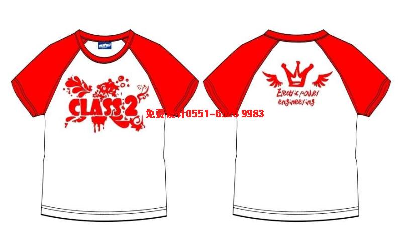 紅色插肩袖班服,前面整體看上去是一大片鮮花,中間印上CLASS 2.后面是皇冠加翅膀。圖案也是紅色的,和衣服色調(diào)比較配。