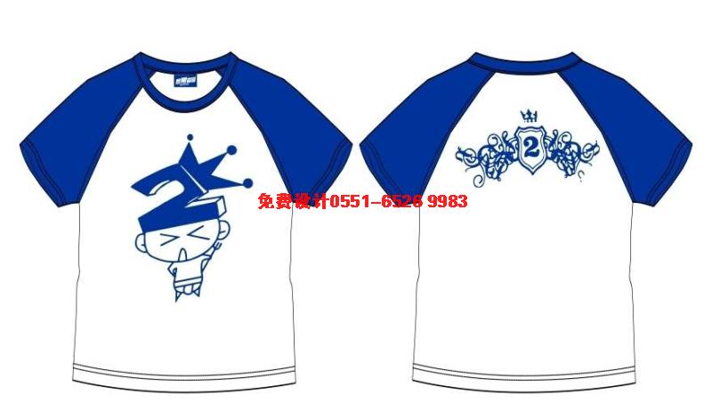 寶藍色圓領插肩袖班服,采用數(shù)字2上帶皇冠,下面是卡通人物,代表2班都奪冠!后面的圖案是花朵2,臂章的感覺。