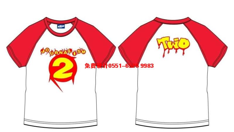 這款紅色插肩袖班服前面是紅色的圖案印刷2旋風,后面是大寫的TWO,流墨的文字效果。