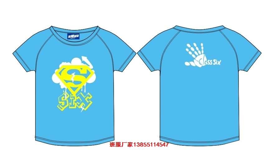 六班班服款式,六班班服款式采用的是藍色底衫,前面是超人鉆石圖案,下面是SIX,后面的班服圖案是手掌,CLASS SIX代表6班。