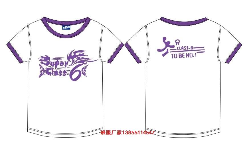 六班班服圖案,這款六班班服圖案,采用的是紫色的圖案加白色的底衫,前面的圖案為SUPER CLASS6,后面的圖案是TO BE NO.1
