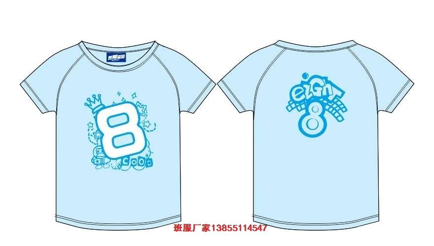8班班服圖案,8班版衫LOGO該款8班班服采用的是淺藍色的圓領T恤,前面印刷大的數(shù)字8為主要圖案,后面是小的數(shù)字8為圖案,圖案顏色為深藍色。