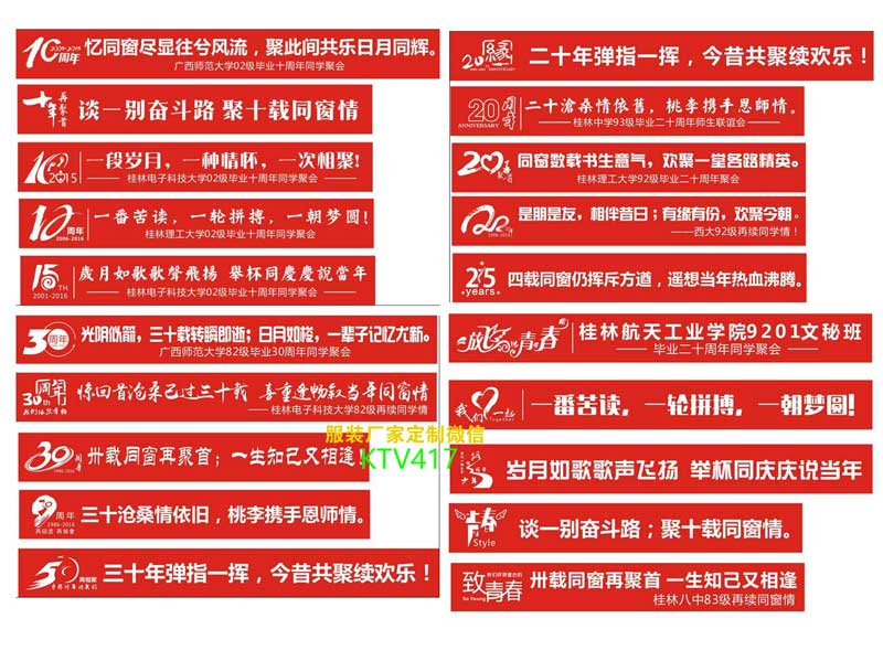 同學(xué)聚會橫幅條幅標(biāo)語文字大全,同學(xué)會橫幅打什么字好看?聚會橫幅文字案例大全,夢瑤服裝,成立12年,擁有上千個(gè)班級的服裝制作經(jīng)驗(yàn),現(xiàn)展示部分同學(xué)會橫幅文字。