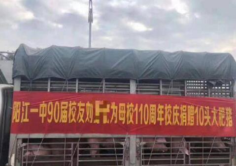 近日,廣東陽江一中迎110周年校慶,一名校友為母校捐贈了10頭大肥豬,用貨車直接拉到了學(xué)校。學(xué)校老師說,這些豬肉將在校慶時供給師生享用,校友的初心是想感激母校,很好的一個校友。